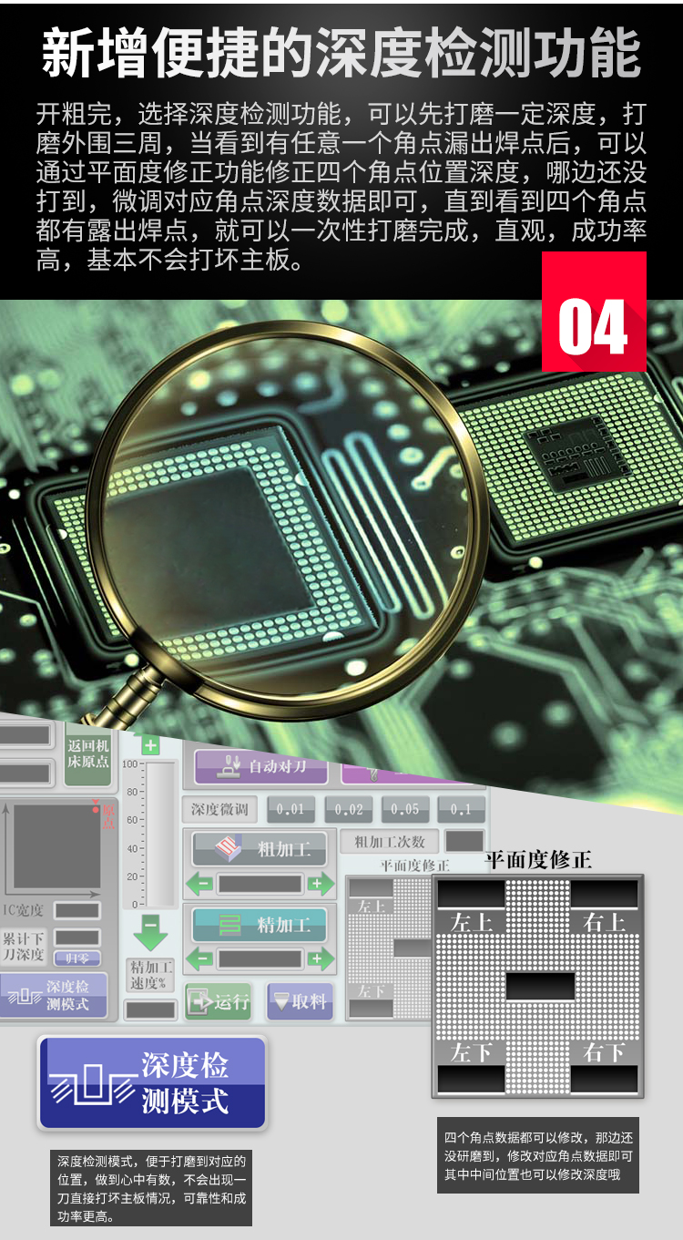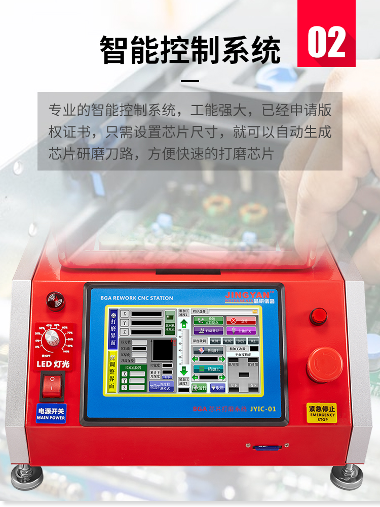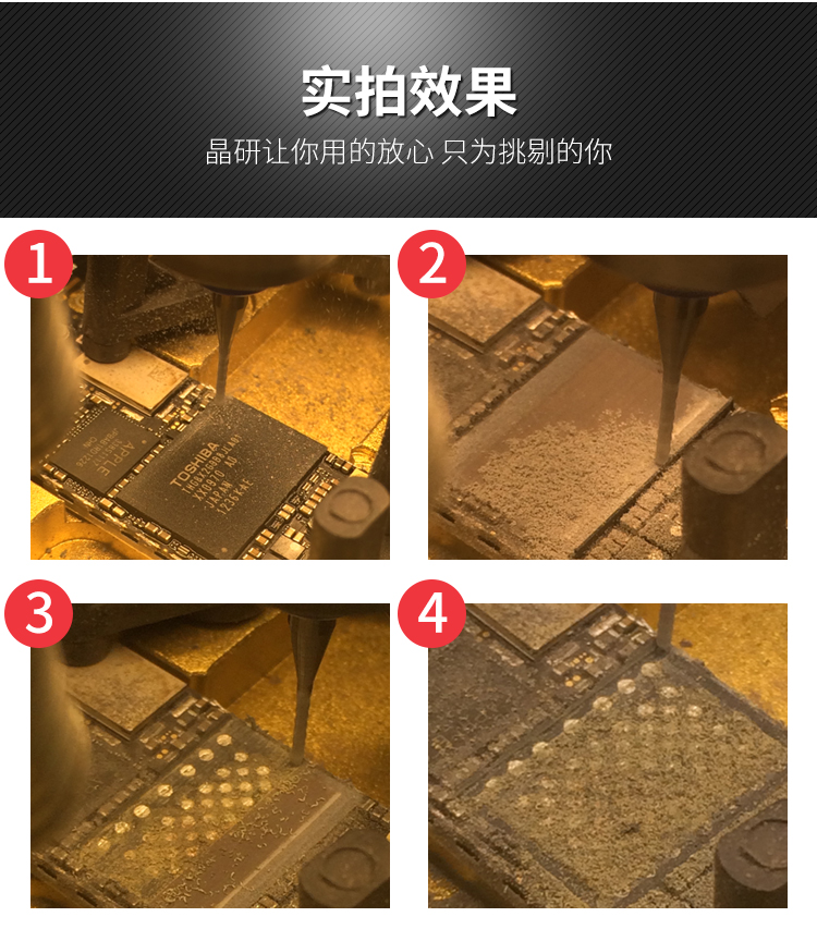 晶研智能BGA芯片拆除機(jī)是由東莞市晶研儀器科技有限公司獨立研發(fā)的全自動BGA芯片維修平臺,配合相應(yīng)高精度定制模具可對各種類型的IC芯片進(jìn)行拆除或者打磨,效果優(yōu)秀。晶研智能BGA芯片拆除機(jī)采用進(jìn)口耗材,整機(jī)的裝配都經(jīng)過嚴(yán)格的把關(guān)。拆除機(jī)以其獨有的平面度檢測功能使得打磨變形的BGA主板更加精確簡單。
