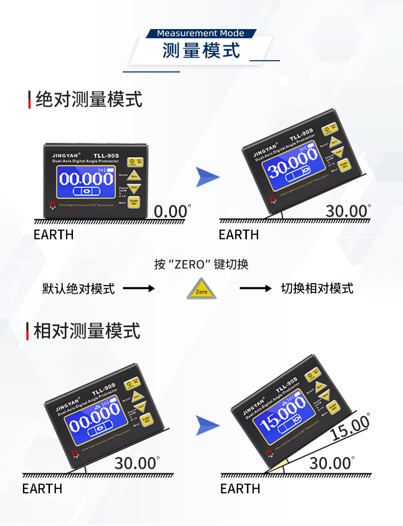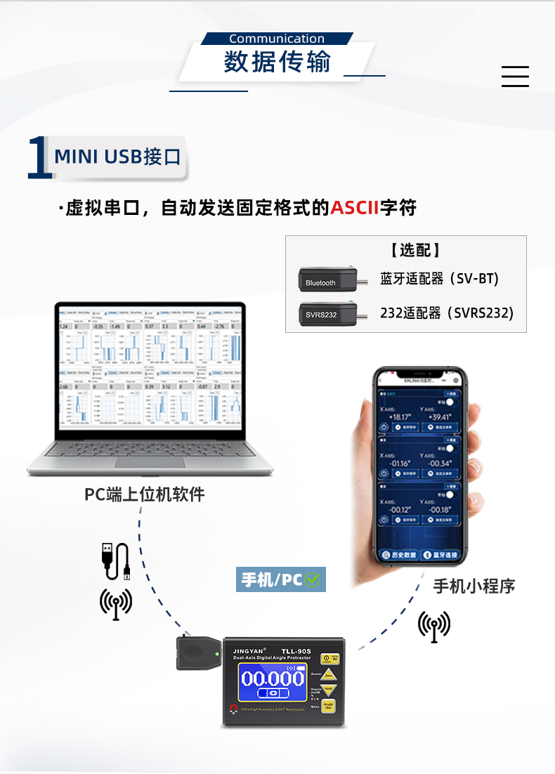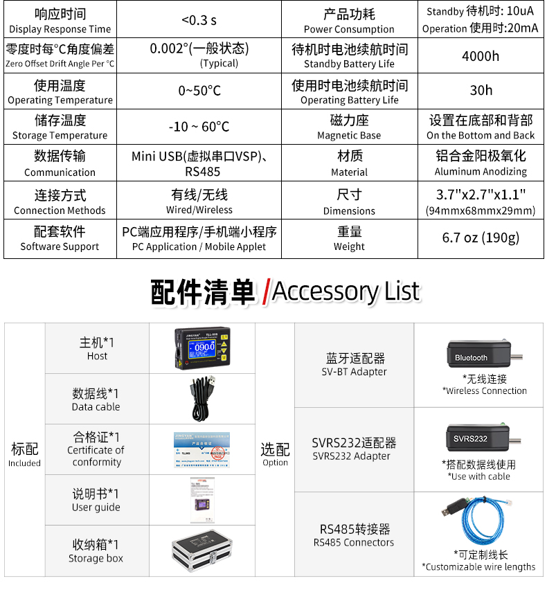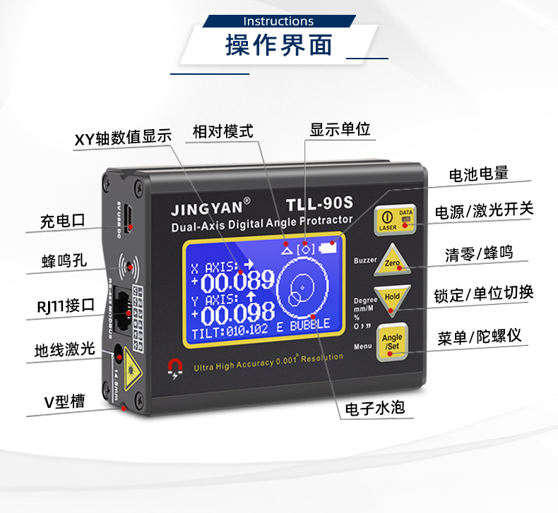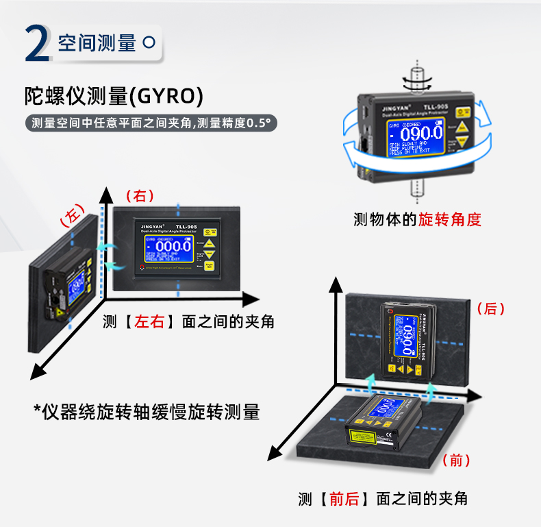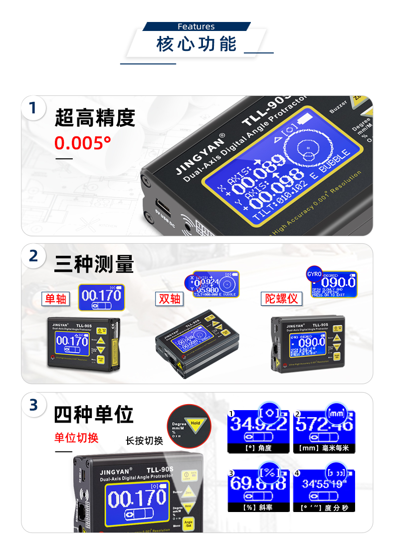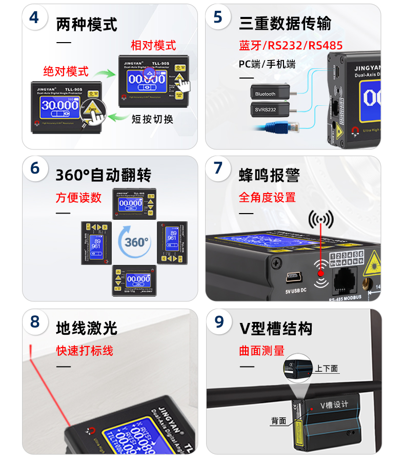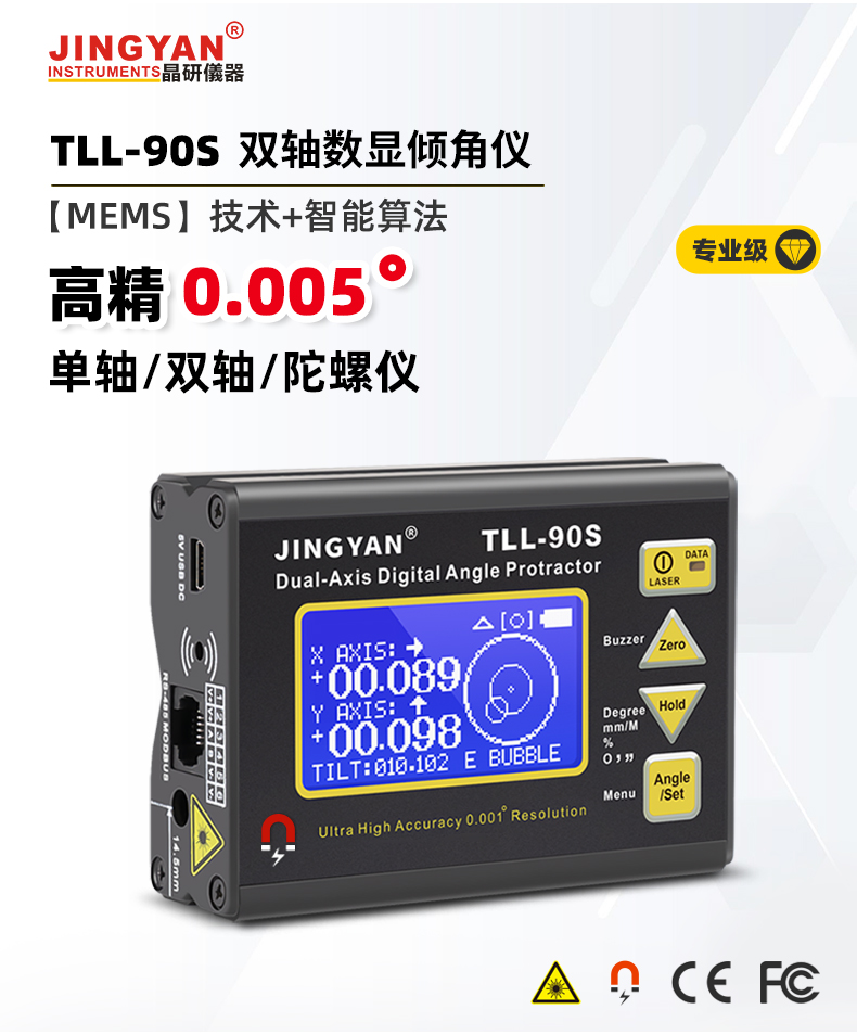 TLL-90S是一款專業(yè)測量水平傾角和空間相對夾角的高精度數(shù)顯傾角儀/水平儀,它基于微機電系統(tǒng)(MEMS)的先進技術(shù),結(jié)合優(yōu)化的補償模型算法,保證傾角儀測量的穩(wěn)定性和重復(fù)性,實現(xiàn)最好精度0.005°,分辨率0.001°,支持單軸4*90°,雙軸±40°測量。儀器可以采用4種測量單位顯示(角度、毫米/米、斜率、度分秒),底部和背部測量基準面有強磁性,V型凹槽設(shè)計便于放置在圓管上進行測量。地線激光功能方便產(chǎn)品打標線。新穎的空間相對夾角功能(GYRO),可以不受環(huán)境限制,測量任意平面之間相對夾角,陀螺儀測量精度±0.5°。三重數(shù)據(jù)存儲功能,連接電腦或手機數(shù)據(jù)傳輸,支持485 Modbus協(xié)議通訊。TLL-90S廣泛應(yīng)用于基建工程,航空實驗,醫(yī)療械,機械制造,科研測試等用途。TLL-90S以其豐富的功能和可靠性,廣受全球客戶青睞。