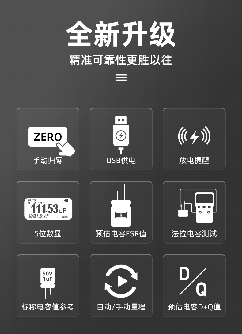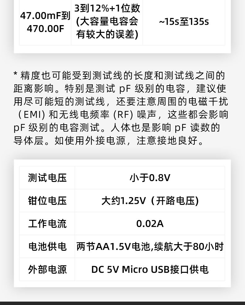 高精度1%,自動量程,超寬量程測試,AVG滑動平均功能,讀取數(shù)值更加精準(zhǔn),一鍵清零按鈕,方便更加穩(wěn)定,減少誤差,自動關(guān)機(jī)功能,節(jié)省電量。