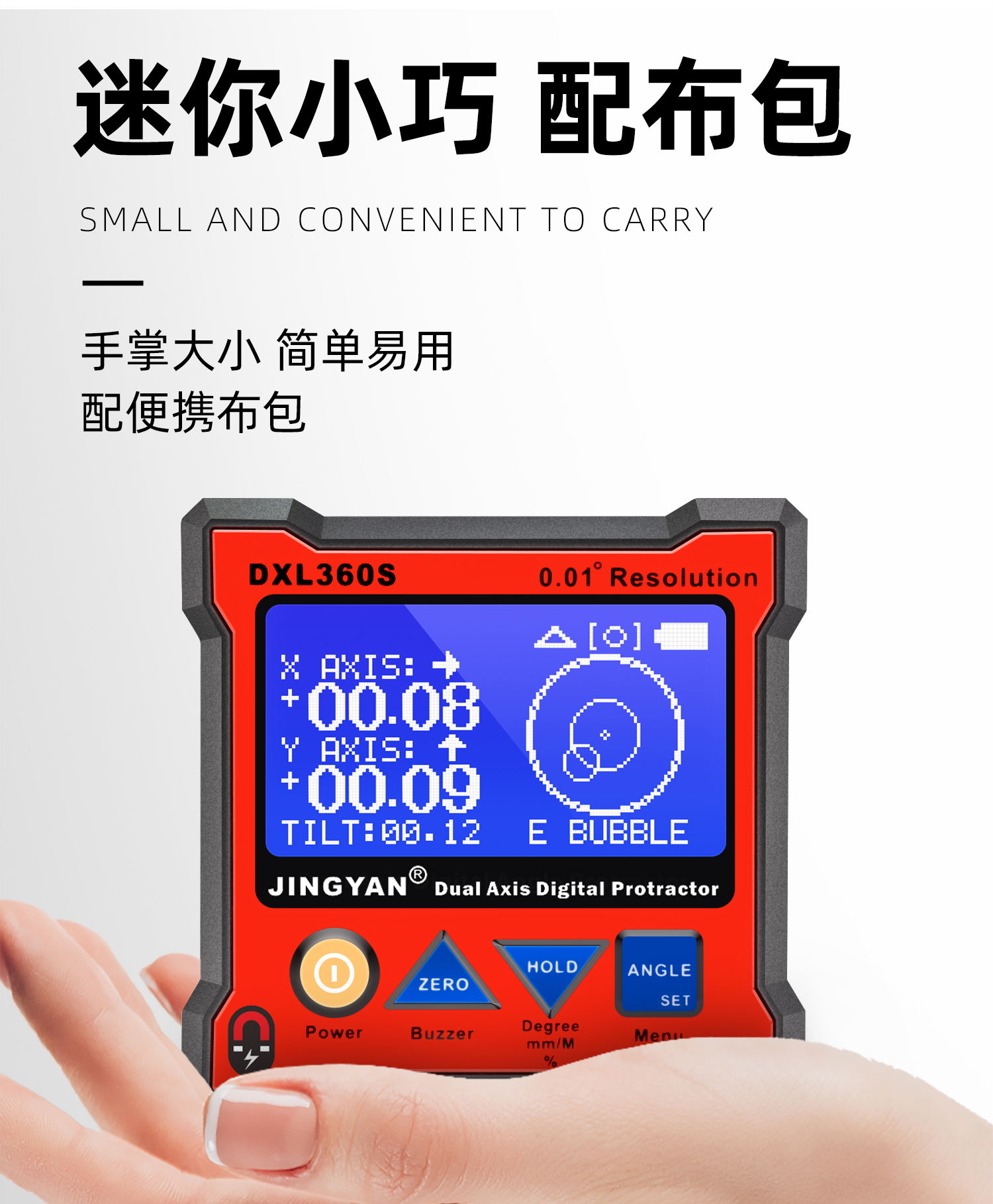 DXL360/S是一款專業(yè)測量水平和空間相對夾角(*DXL360S專有)的高精度數顯傾角儀/水平儀,它基于微機電系統(tǒng)(MEMS)的先進技術,結合優(yōu)化的補償模型算法,保證傾角儀測量的穩(wěn)定性和重復性。DXL360S精度高達0.05°,分辨率0.01°,可以采用3種測量單位顯示(角度、毫米/米、斜率),特有的空間相對夾角功能(GYRO),可不受環(huán)境限制,測量任意平面之間相對夾角,陀螺儀測量精度±0.5°。DXL360實現最好精度0.1°,分辨率0.02°,可以采用2種測量單位顯示(角度、毫米/米)。DXL360/S支持單軸4×90°,雙軸±40°測量,底部和背部測量基準面有強磁性,V型凹槽設計便于放置在圓管上進行測量。雙重數據存儲功能,連接電腦或手機進行數據傳輸。DXL360/S廣泛應用于機械制造、汽車維修、醫(yī)療行業(yè)、木材加工、通訊檢測、家居裝潢等用途。DXL360/S以其豐富的功能和實用性,廣受全球客戶青睞。