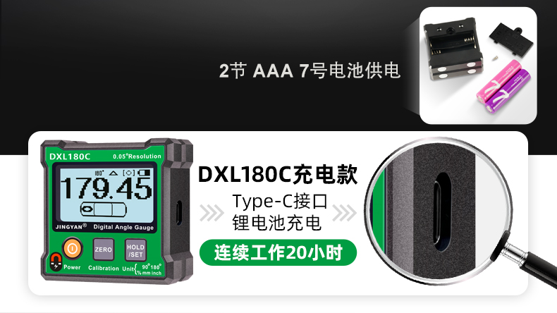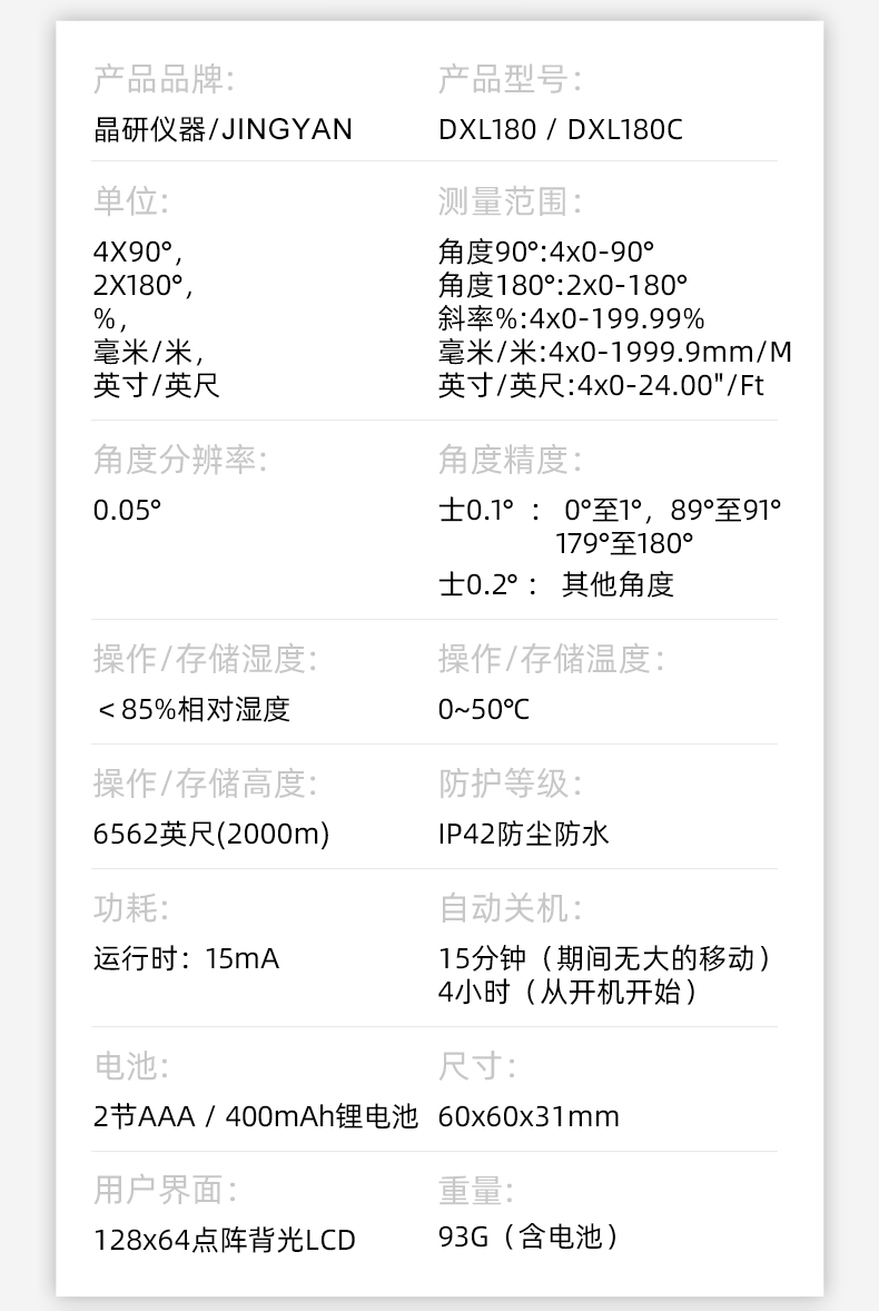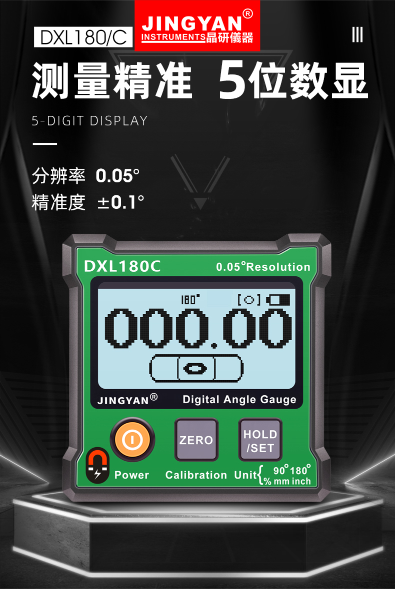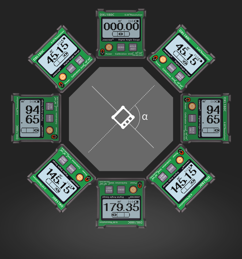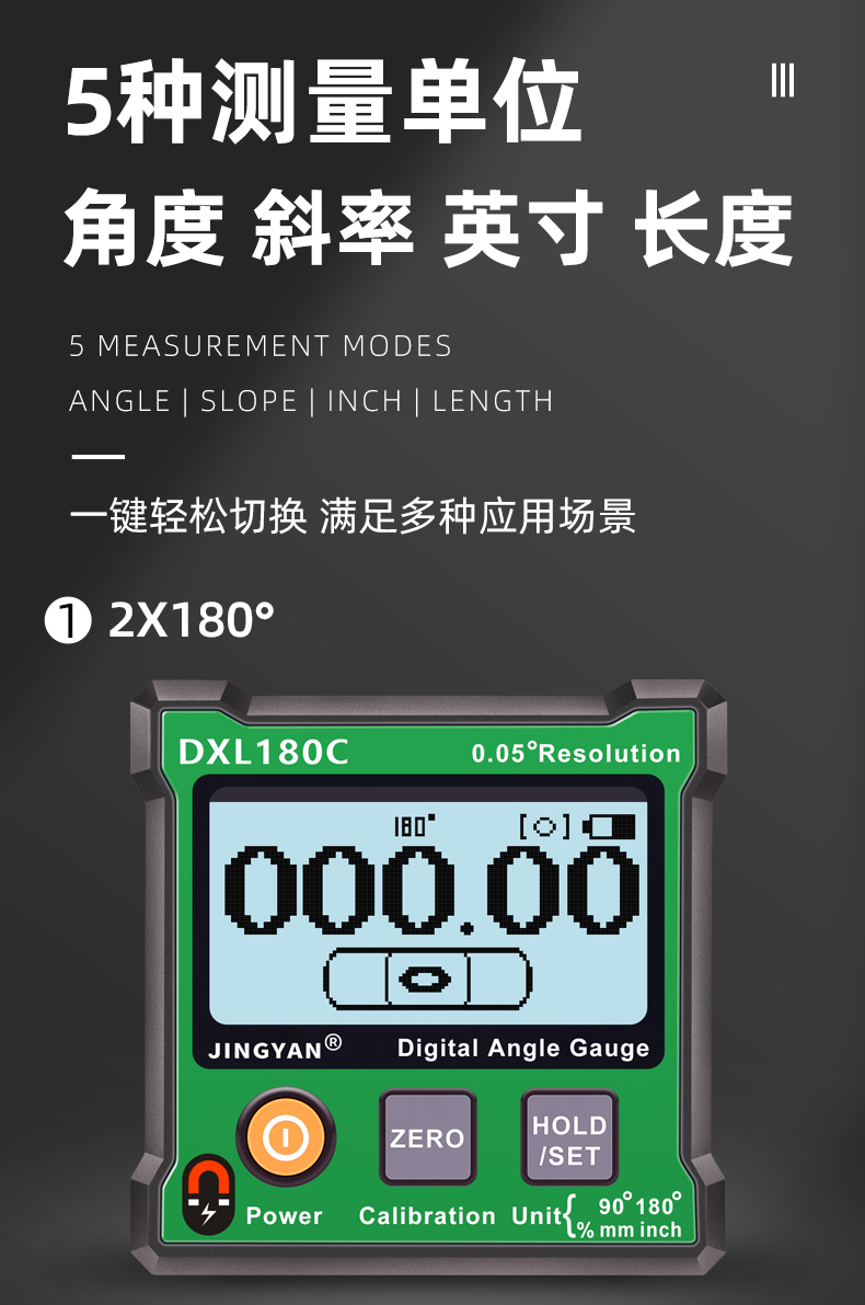 DXL180/C是一款可以使用多種單位顯示的數(shù)字角度儀,支持單位為角度、斜率、英寸和毫米/米的讀數(shù)。測量范圍為2*0-180°和4*0-90°,儀器底部測量面具有強力磁性。V形凹槽設(shè)計便于放置在圓形管上進行測量。支持IP42等級防塵防水,背面預(yù)留M4螺絲孔,方便安裝固定。DXL180/C廣泛應(yīng)用于木工切割、機械制造、裝修設(shè)計、攝影愛好、產(chǎn)品檢測等領(lǐng)域。