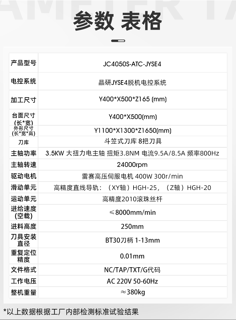 該設(shè)備采用3.5KW大扭力電主軸BT30刀柄,刀具最大裝夾直徑13mm,斗簽式自動(dòng)換刀刀庫(kù)可配置8把刀具,滿足多工序換刀加工,適用更多應(yīng)用場(chǎng)景;升級(jí)高精高速2010滾珠絲桿和HGH25直線導(dǎo)軌,精度高,支持批量加工生產(chǎn),性能穩(wěn)定;配套雷賽高壓伺服電機(jī),400W,300r/min,可實(shí)現(xiàn)8000mm/min的加工速度,滿足高效加工生產(chǎn)需求;晶研JYSE4專(zhuān)業(yè)版脫機(jī)系統(tǒng)無(wú)需鏈接電腦,U盤(pán)讀取程序。支持?jǐn)嚯娎m(xù)雕,跳行加工,手輪引導(dǎo),一鍵啟停等功能,批量加工,簡(jiǎn)單實(shí)用;主軸循環(huán)水冷系統(tǒng),自主設(shè)計(jì)干凈環(huán)保。主軸高速運(yùn)行,循環(huán)冷卻液可以快速帶走主軸熱量,支持長(zhǎng)時(shí)間運(yùn)行,主軸冷卻效果非常好。