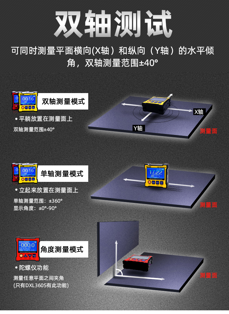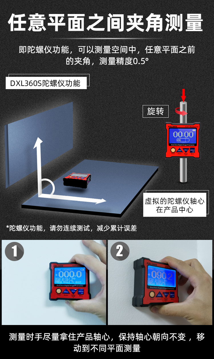 DXL360S傾角儀支持空間任意平面之間夾角測試(即陀螺儀功能),可以測試空間平面中,任意兩個平面之間相對角度,測量精度0.5°。對于復(fù)雜的測試環(huán)境或者不相鄰的兩個測試面,有了陀螺儀功能,讓測試他們之間的夾角變成了可能。