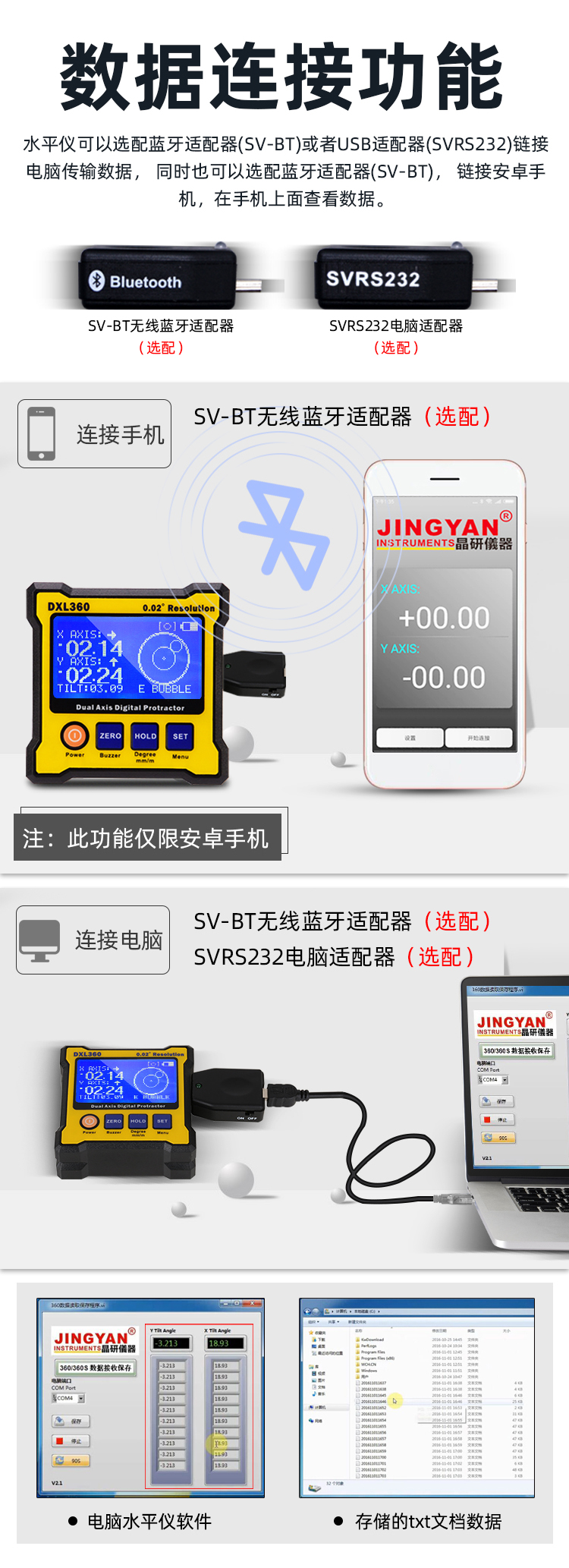 晶研全系列雙軸水平儀,均支持聯(lián)接手機APP/電腦軟件進行數(shù)據(jù)傳輸功能,便于數(shù)據(jù)分析,繪制表格,數(shù)據(jù)累計等使用。還可以支持一機聯(lián)接多臺水平儀,同時數(shù)據(jù)傳輸。有線傳輸/藍牙傳輸都能夠支持!靈活的拓展功能,專為技術(shù)人員測試使用。專業(yè)貼心,只為您用的更好!