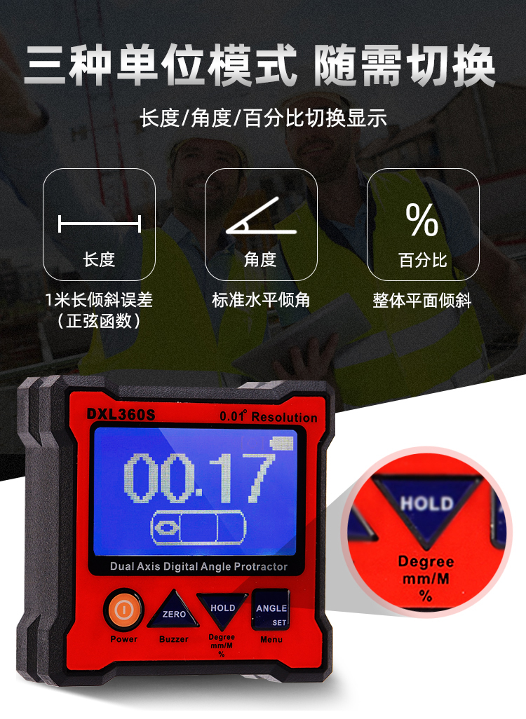 很多情況下,我們會發(fā)現(xiàn),僅僅只能夠顯示角度單位已經(jīng)無法滿足我們的要求,把角度單位換算成長度單位mm(正弦函數(shù)),或者把角度單位直觀的告訴我傾斜率到底是多少?這些功能全部都已經(jīng)為您想好了。晶研DXL360S傾角儀支持這三種單位檢測模式,隨心切換使用,專業(yè)智能!